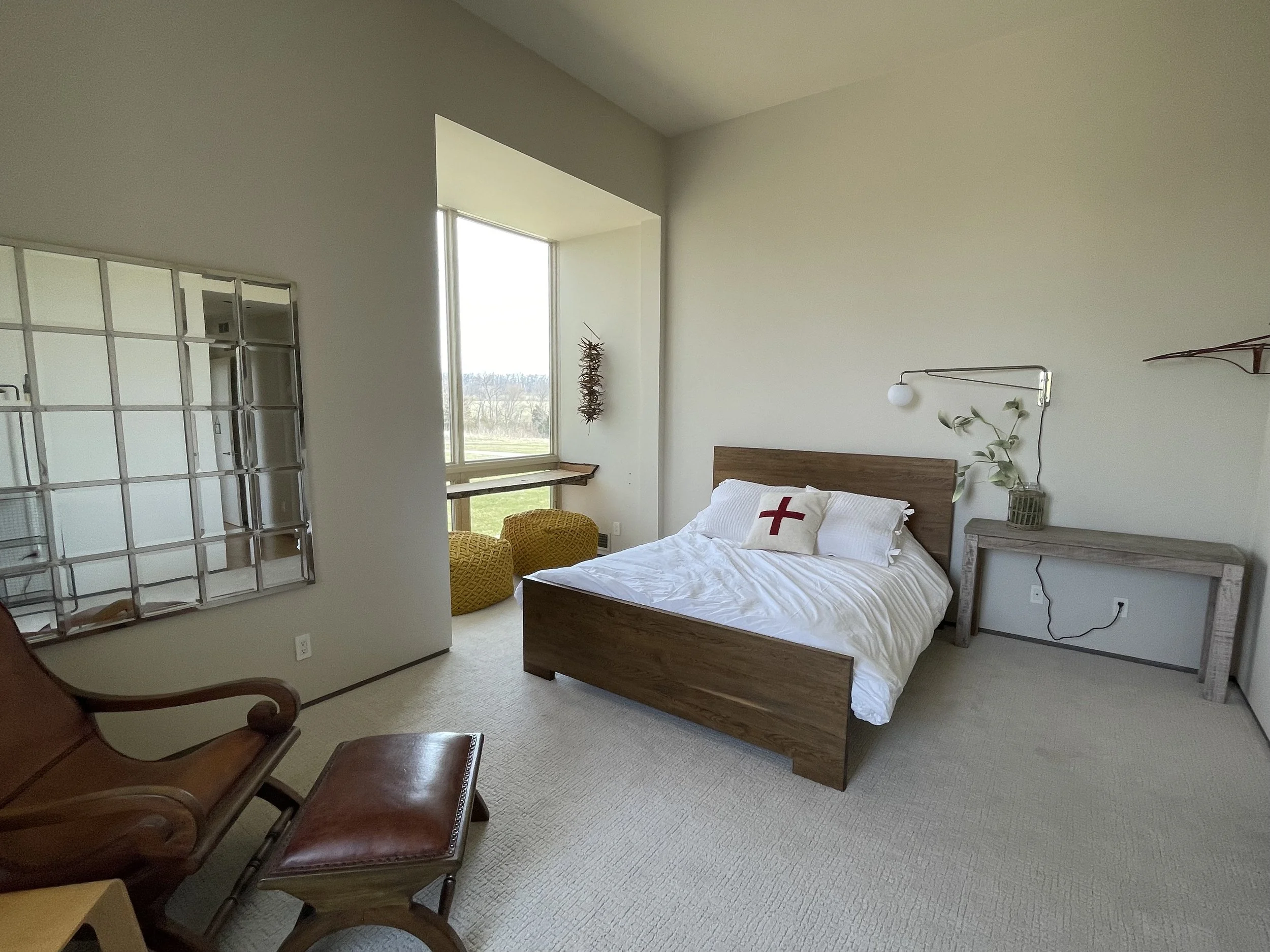 A spacious room with large windows, lots of natural light, and a queen bed