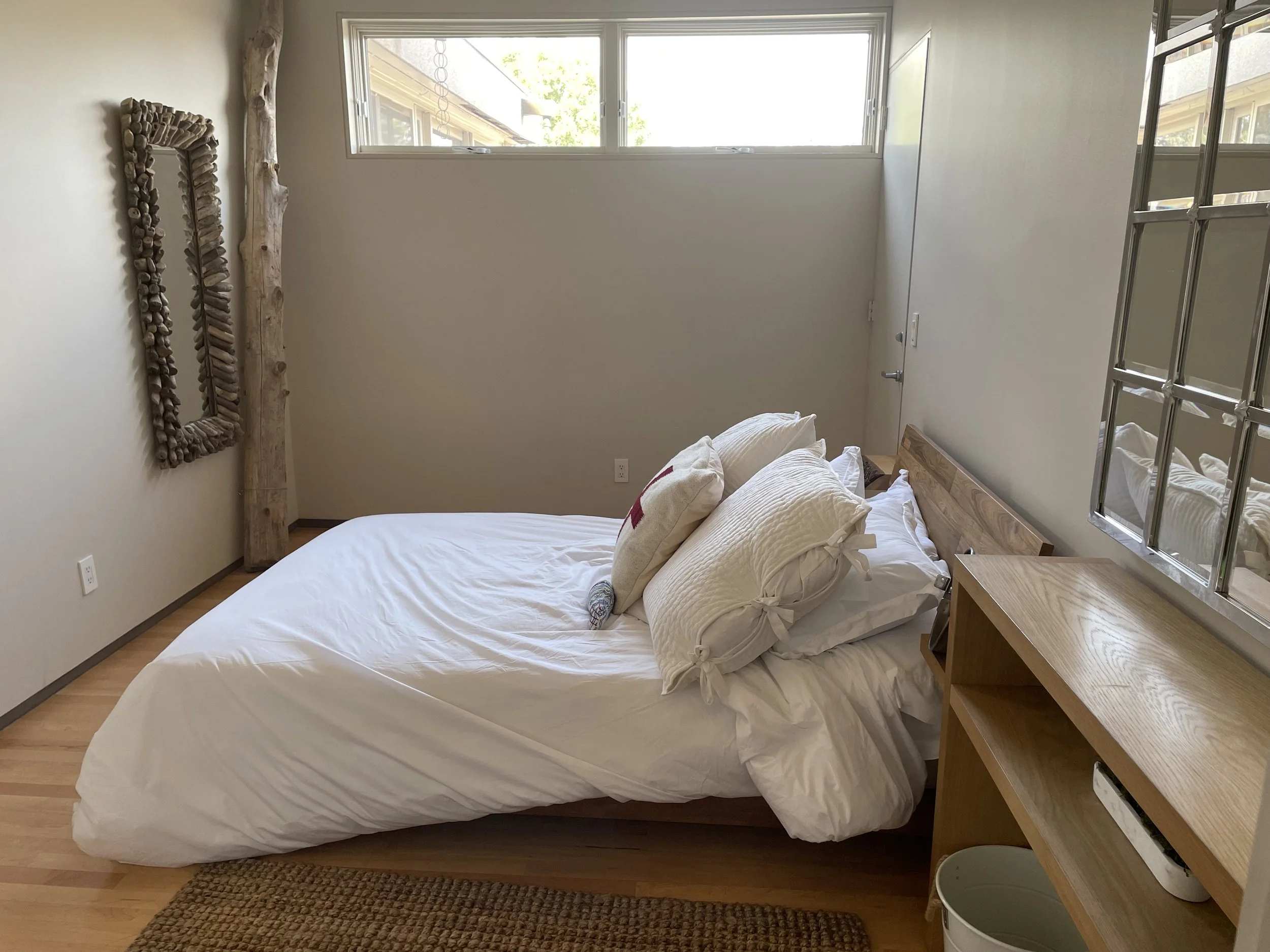 A private double bed room well lit with transom windows, perfect for the solo attendee